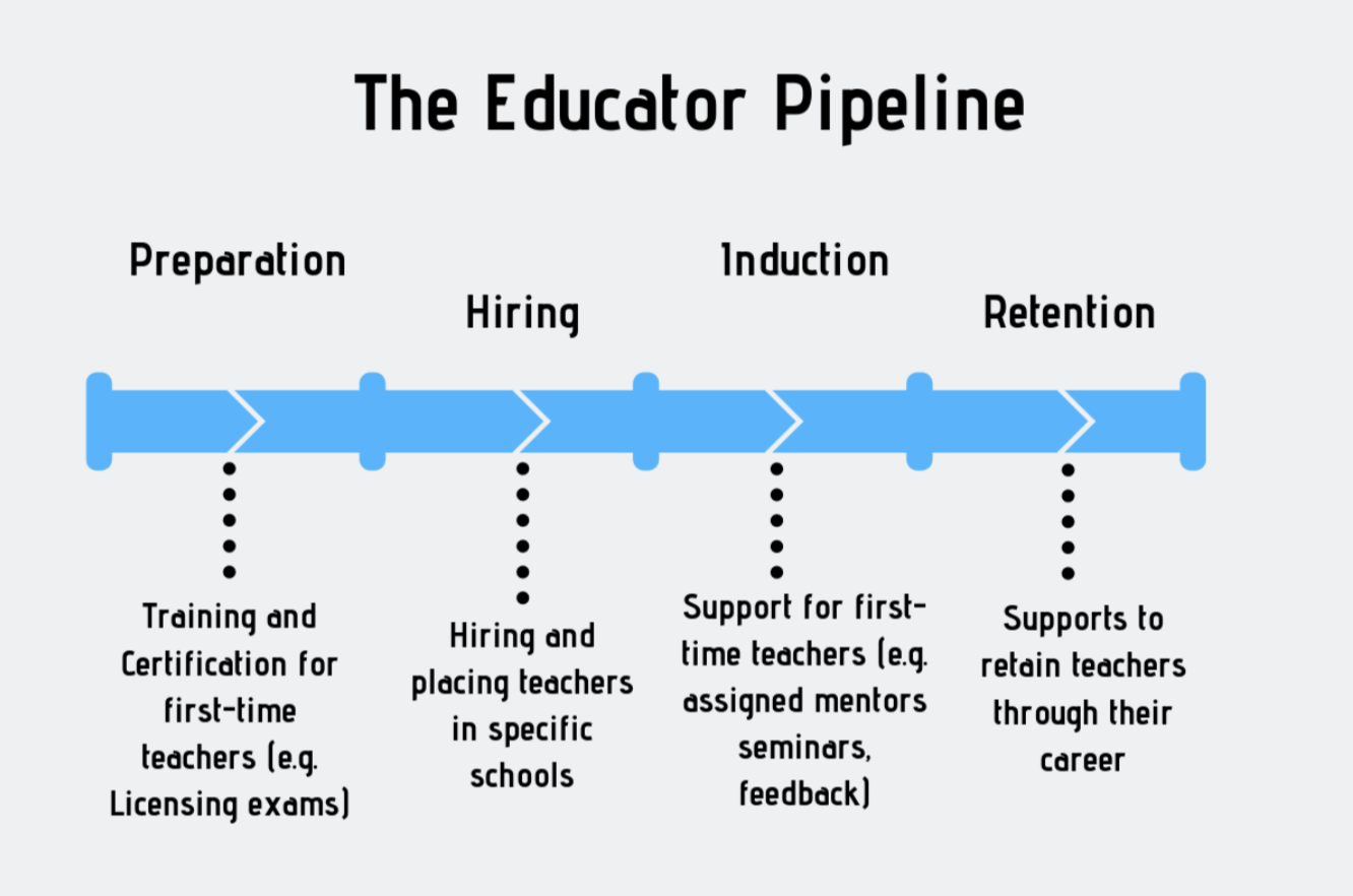 The teacher “induction” section of the educator pipeline offers professional development for first-time teachers to learn from experienced teachers. Induction can include mentorship from veteran teachers, seminars, and informal feedback sessions.