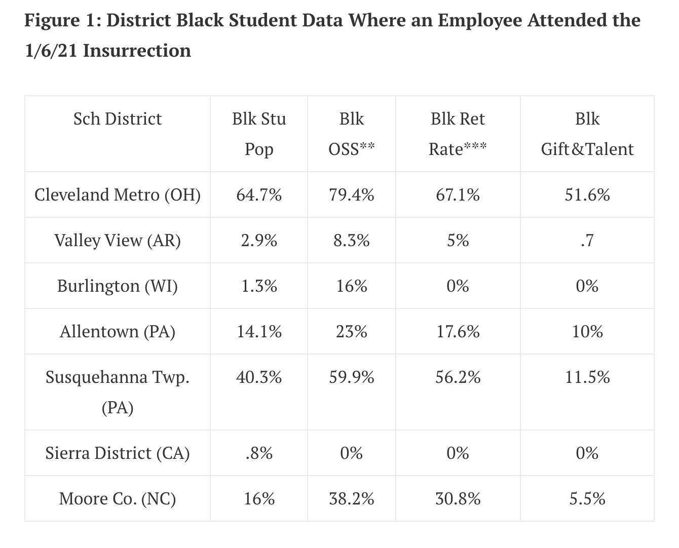 If we consider the track record of schools where an employee attended the insurrection, we find that Black students in just about all of them are disproportionately suspended, retained, and are underrepresented in gifted and talented courses (see figure 1).