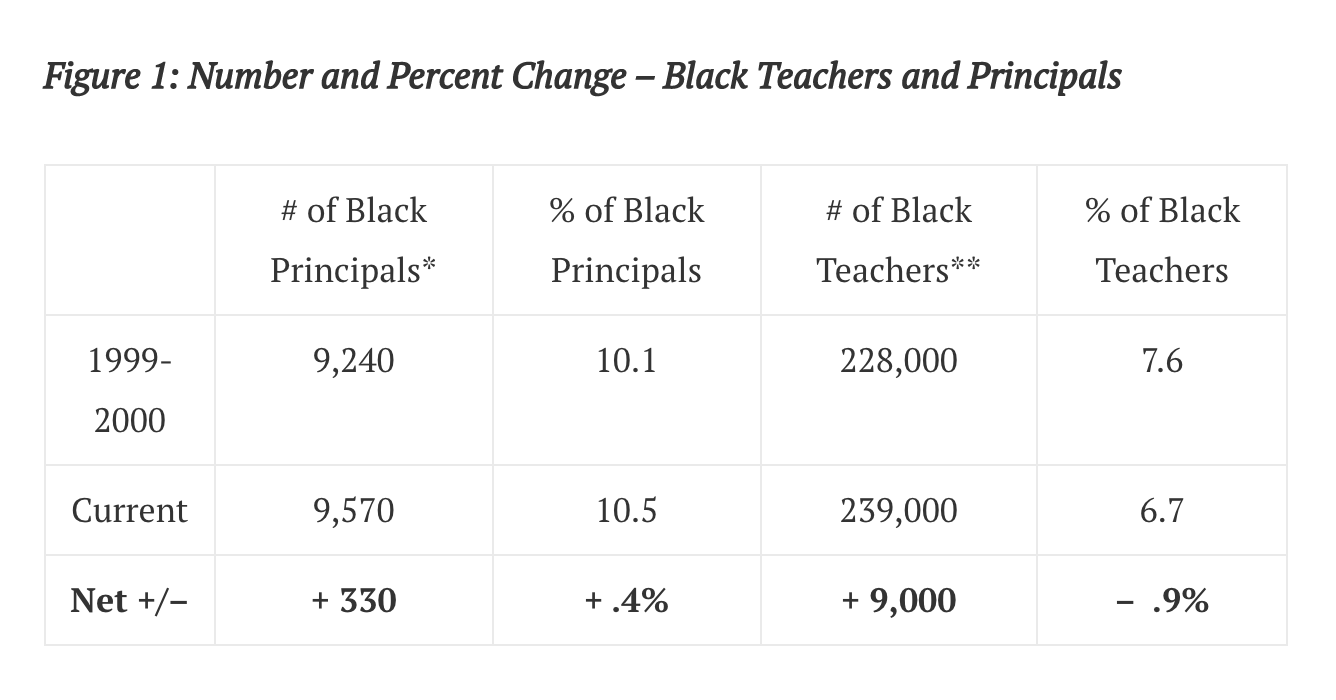 The report cited a study saying [pullquote position="right"]Black principals are more likely to hire a Black teacher[/pullquote] than a white principal in the same school and that Black teachers are less likely to leave their school when the school is led by a Black principal than when that same school is led by a white principal.
