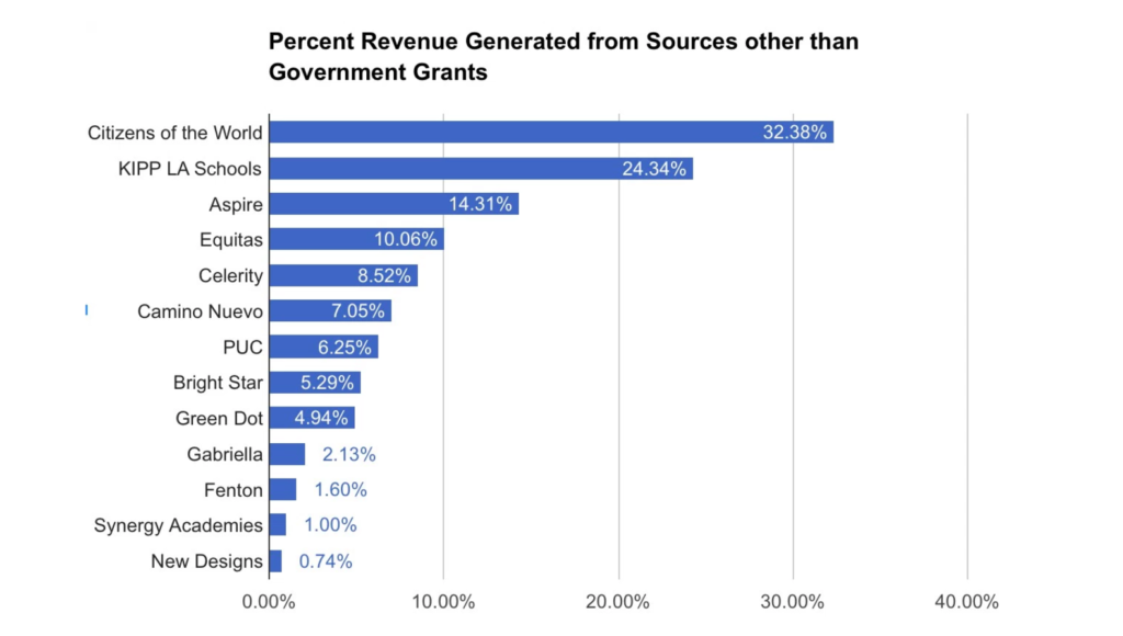I was surprised to see that KIPP is not king when it comes to private grants. In 2015, Citizens of the World raised a whopping 32 percent of its revenue through private grants. KIPP was not far behind raising almost 25 percent of their revenue through private means. But as you go down the list, you see major charter players, such as Green Dot and PUC raise far less (as a percent) from private sources. This is not to say that they spend any less per student—in fact Green Dot’s per pupil revenue appears to be higher than KIPP’s, but it says that the source of the revenue is clearly different.