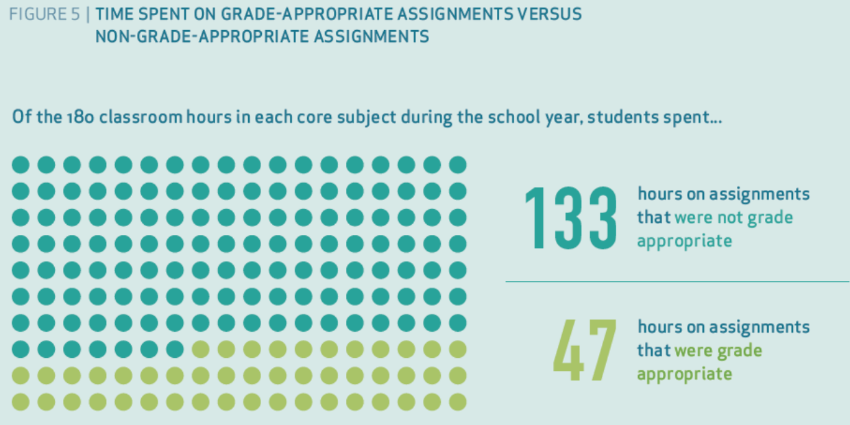 A big cause of the problem, according to the report, is that teachers are often going it alone when it comes to finding assignments and materials to teach their students. Many times they create their own materials. The result is that only 1 in 5 assignments is aligned to the grade-level academic standards kids are supposed to be learning. It gets slightly better when they use what the district has to offer. Districts choose materials that align 38 percent of the time. That’s not good enough. When students actually got grade-level assignments and homework, it’s as if they had nearly two more months in school than their peers who didn’t. They just learned that much more. High-quality classwork is even more valuable for students who start out a year behind their peers. The data shows [pullquote]they learn, on average, 7.5 months’ worth of material more than kids who don’t have grade-level appropriate schoolwork.[/pullquote] The Opportunity Myth has been exposed. Now it’s time to bust it by giving kids what they need to thrive. They shouldn’t have to wait years for something schools could do in months.