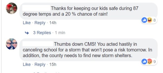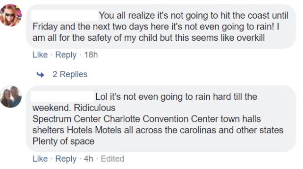 Hurricane Florence has forced evacuations to emergency shelters and we must consider safety in new ways. CMS is proud to serve our state and region by opening several CMS school campuses as emergency shelters led by the Red Cross in partnership with other agencies.Parent reactions to CMS’s decision were predictably mixed, with some praising the move but others choosing to see the issue only in terms of the personal inconvenience posed by unexpectedly having to take care of their own children: