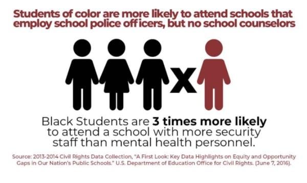 The heavy use of law enforcement in schools drains money from other investments that could more effectively reduce disciplinary incidents. For example, according to CRDC data, 1.6 million students attend a school with a sworn law enforcement officer, but not a school counselor.