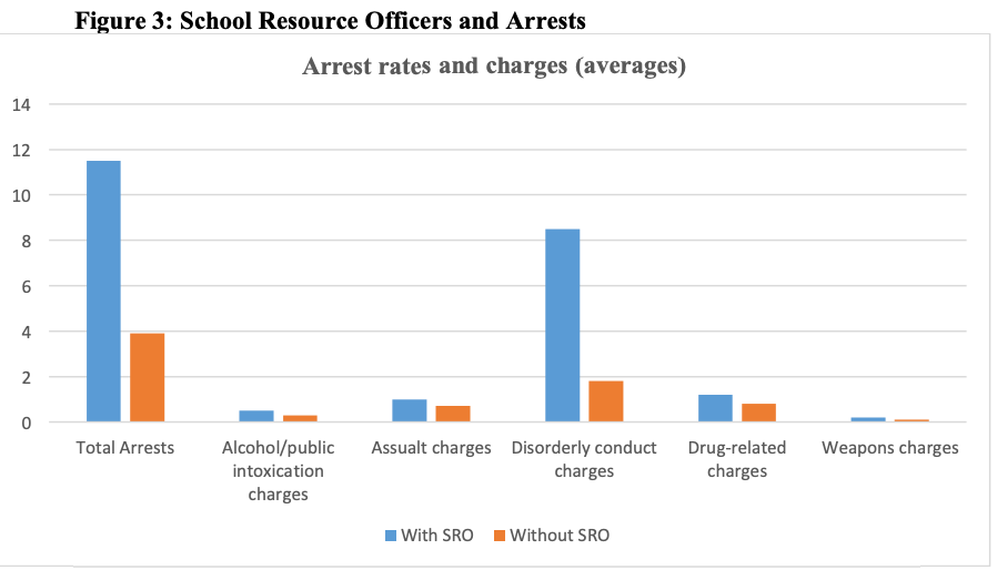 During the latest school year for which we have data available, over 290,600 students were referred to law enforcement agencies or arrested. Schools with SROs have higher arrest rates, especially for disorderly conduct: