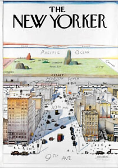 In the hallway of my apartment growing up in Brooklyn, there was a poster of a cover from the New Yorker Magazine entitled "View of the World from 9th Avenue."